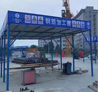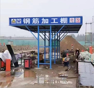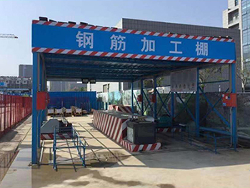 鋼筋加工棚,工地鋼筋防護棚詳解,鋼筋加工棚是施工現(xiàn)場內對鋼筋進行拉直、彎曲、焊接等鋼筋加工作業(yè)的場地。鋼筋加工棚長和寬尺寸,要根據鋼筋加工數(shù)量和使用機械的多少確定加工棚的大小,一般情況有6*9m、6*12m、9*12m等幾種,可以根據實際情況酌情采用,也可自行設計長寬尺寸。現(xiàn)有技術的鋼筋加工棚一般為鋼管搭設式的,先在現(xiàn)場利用扣件將多根鋼管扣接搭設成加工棚的整體式鋼結構,該鋼結構包括四根位于四角的鋼管立柱和四根鋼管橫梁,每根鋼管橫梁的兩端分別與兩根鋼管立柱的頂端固定,上述四根鋼管立柱和四根鋼管橫梁構成了整體式鋼結構的鋼骨架,該鋼結構還包括多根連接加固鋼管,每根連接加固鋼管的兩端分別固定在構成鋼骨架的兩根鋼管之間。待鋼管搭設式的鋼結構搭設完工后,校驗該鋼結構強度 符合設計要求,再在該鋼結構頂部鋪設一層彩鋼板。然后在鋼結構的四根鋼管橫梁上焊接多根豎直向鋼管,再然后用與鋼管橫梁平行的水平向鋼筋與同一排的豎直向鋼管通過扣件扣接固定,這樣,多根豎直向鋼管和四根水平向鋼筋就構成了防墜落保護欄桿,最后,在欄桿上鉤掛安全標語橫幅,整個鋼筋加工棚施工完畢。